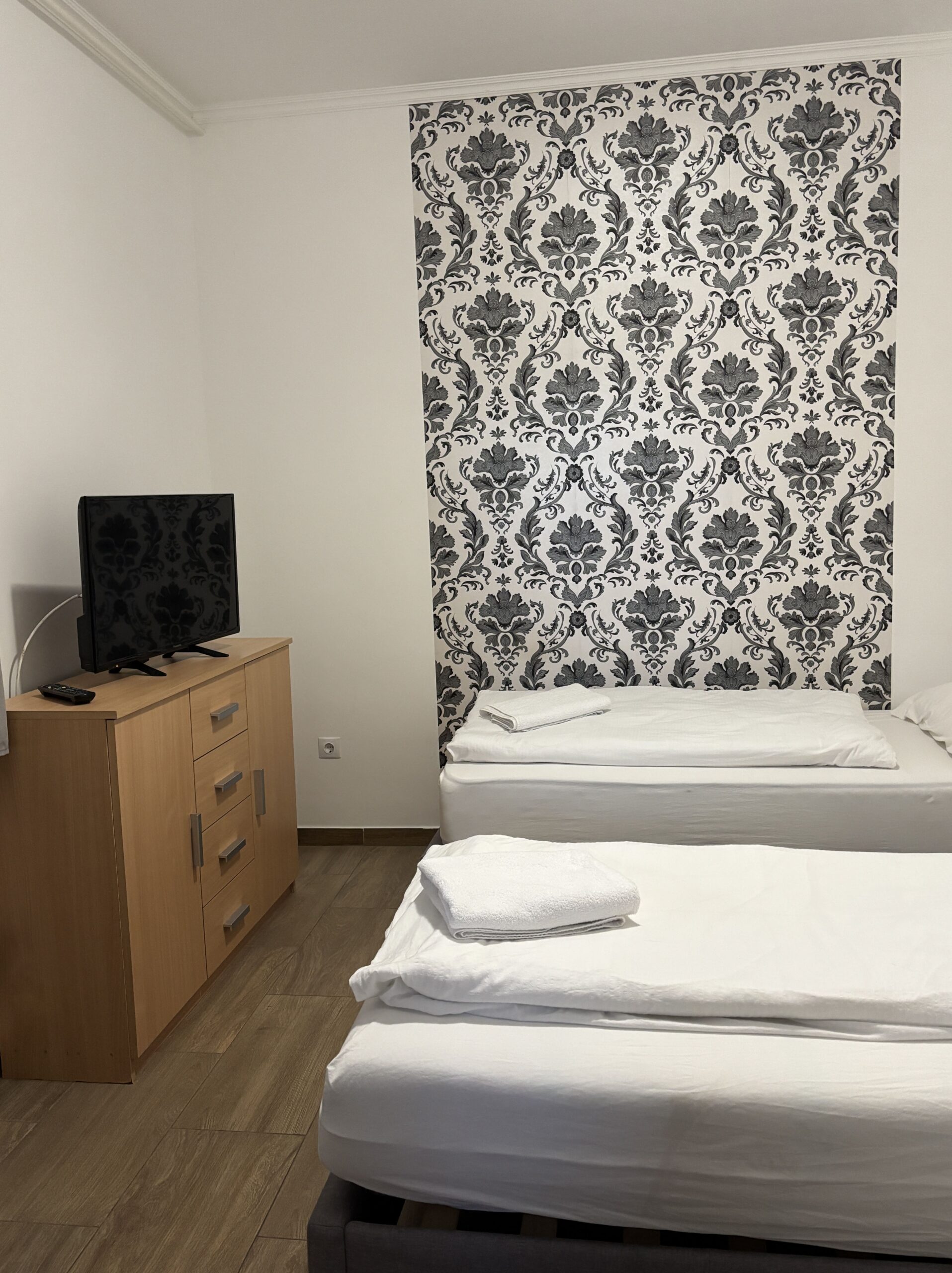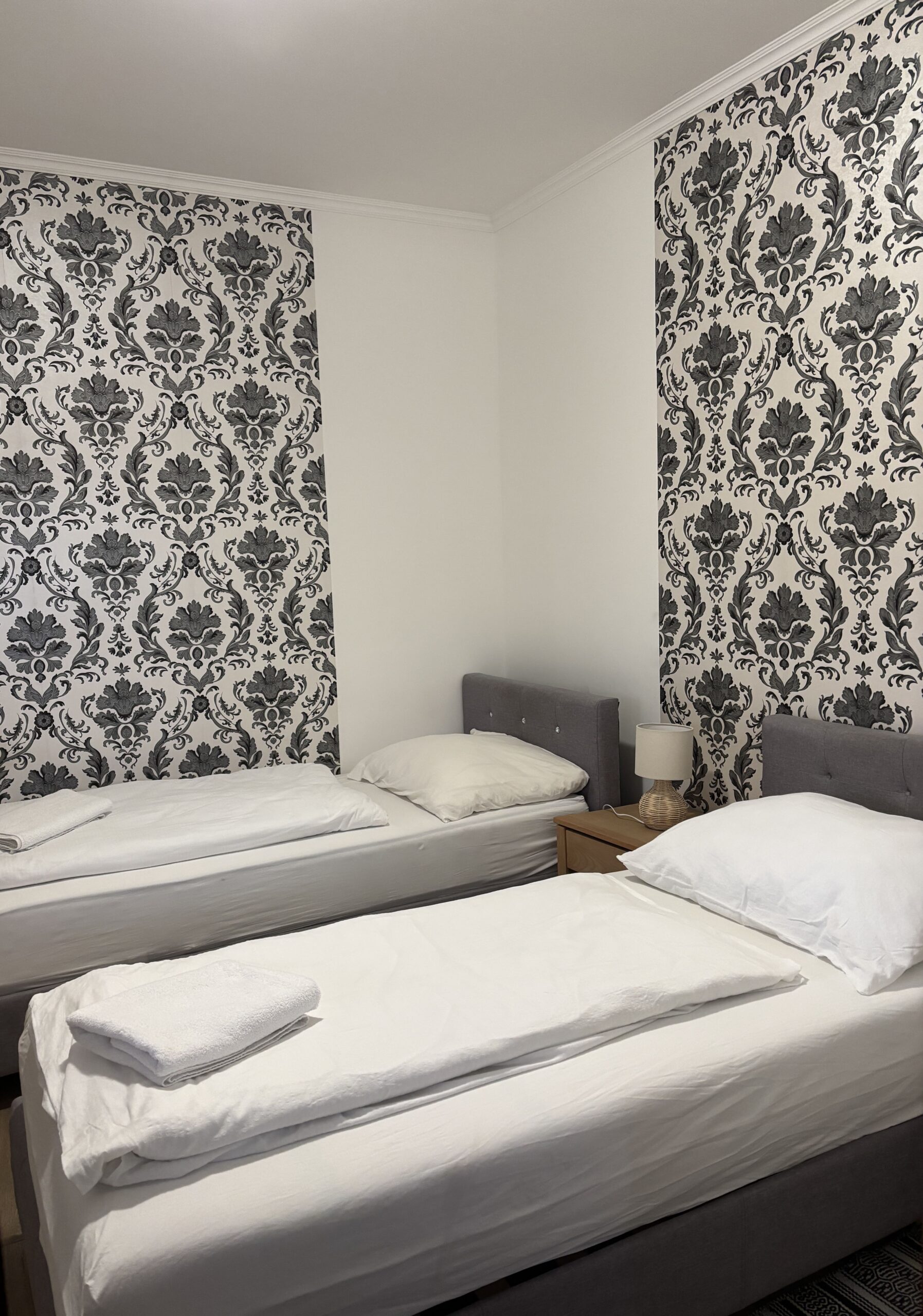 Ez a két apartman egybenyíló, melyben kényelmesen elfér 4 fő. Az apartmanban található 2 konyha, fürdő, mosdó illetve 2 hálószoba. Továbbá tartozik hozzá 2 terasz, az egyik a kerthelyiségre néz, a másik az utcafrontra. A hűtésről – fűtésről klíma gondoskodik. Matrac méretek: 4 db 195*85 cm