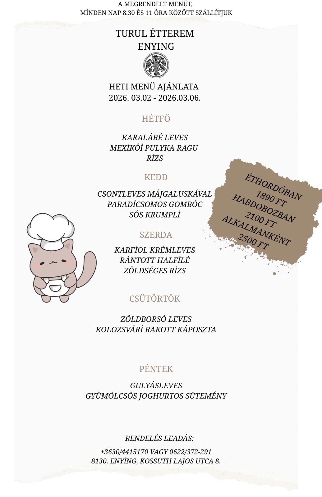 Aktuális heti menünket lent az “Étlap & Heti menü” szekcióban találjátok